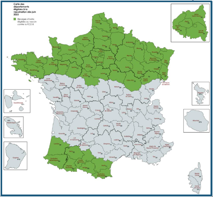 Concernant la FCO-8, l’État a décidé de commander des vaccins pour protéger le cheptel ovin de France métropolitaine. Le vaccin retenu est celui du laboratoire Melchior : Bluevac 8, en double injection pour les ovins, à 3 semaines d’intervalle. L’Etat a commandé 7 millions de doses (en équivalent ovin, cela représente 14 millions pour la première injection et le rappel 3 semaines plus tard). Le calendrier de livraison des doses par le laboratoire est étalé de fin juin à fin septembre (une livraison à chaque fin de mois). La 1ère livraison comporte 1,750 million de doses (soit 3,5 millions avec la première injection et le rappel). C’est pourquoi l’Etat a décidé d’ouvrir la vaccination contre la FCO-8 à une partie du territoire pour la première livraison. Les régions Bretagne, Normandie, Grand-Est, Hauts-de-France, Ile-de-France et les départements suivants (53, 72, 28, 41, 45, 89, 21, 70, 90, 40, 64, 32, 65, 31 09, 11 et 66) pourront commander des doses dès le début du mois du juillet (voir carte ci-après). Le reste des régions et départements pourra commander dès la deuxième livraison prévue fin juillet.